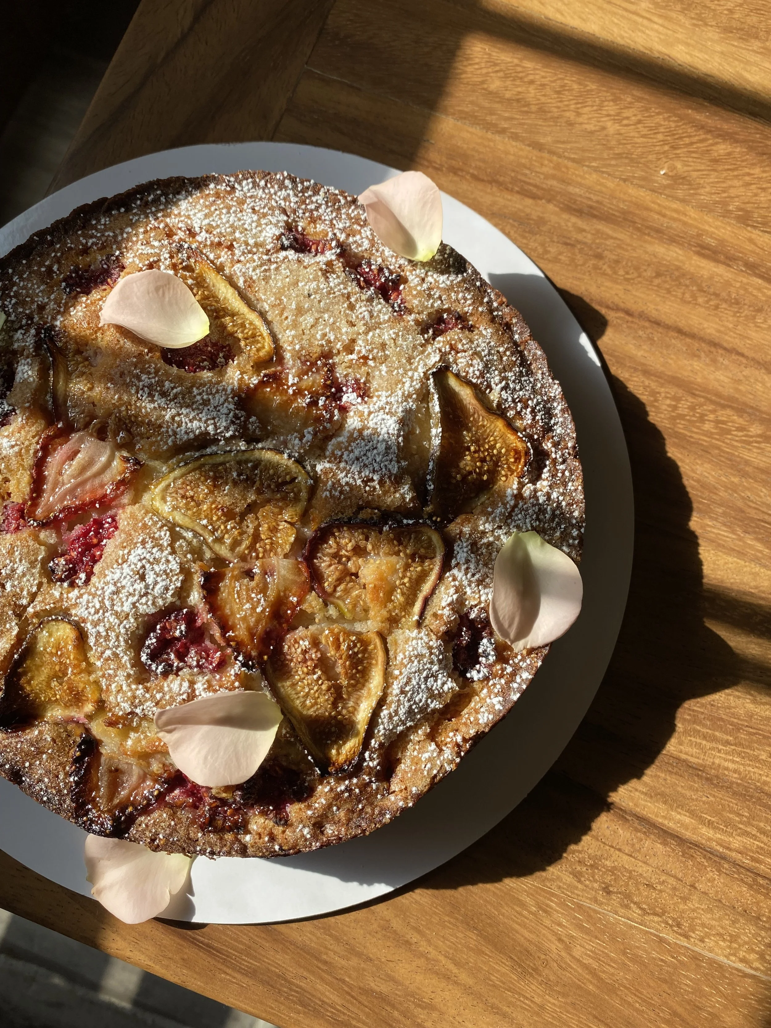 Pie de limón con una base de galleta Biscoff y coco tostado, crema montada de yogurt griego, flores comestibles